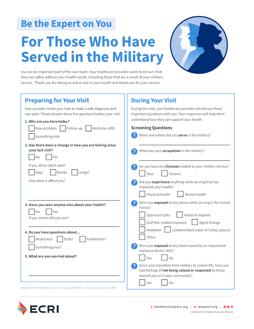 ECRI launched the SALUTE program – free for all healthcare providers and others in the healthcare ecosystem – so that no matter where a veteran seeks healthcare, they receive the best care possible, tailored to their unique needs and service-related health risks.